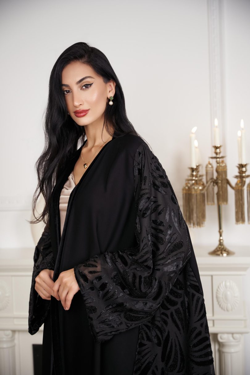 قماش الكريب العملي مع مخمل منقوش في الجوانب بتفاصيل انيقه